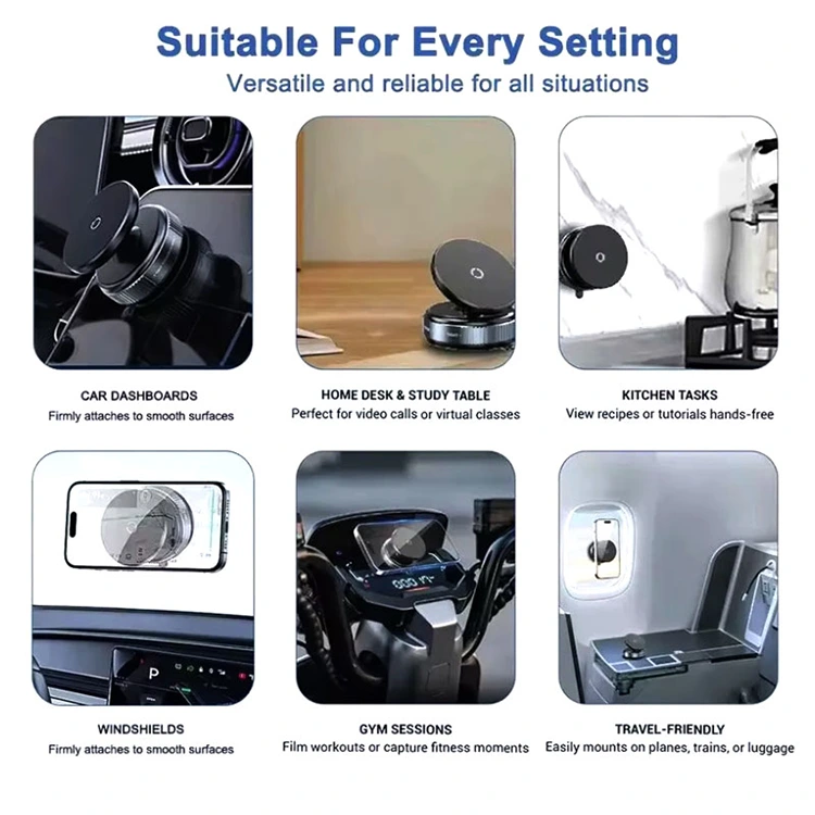 Гнучке використання: це кріплення для автомобільного телефону легко встановити та безпечно. Поверніть основу вліво, щоб міцно закріпити її на будь-якій гладкій поверхні. Поверніть основу вправо, щоб відпустити, щоб зняти або змінити її положення. Кульовий шарнір, що обертається на 360°, дозволяє налаштувати телефон під будь-яким кутом огляду для максимальної зручності.