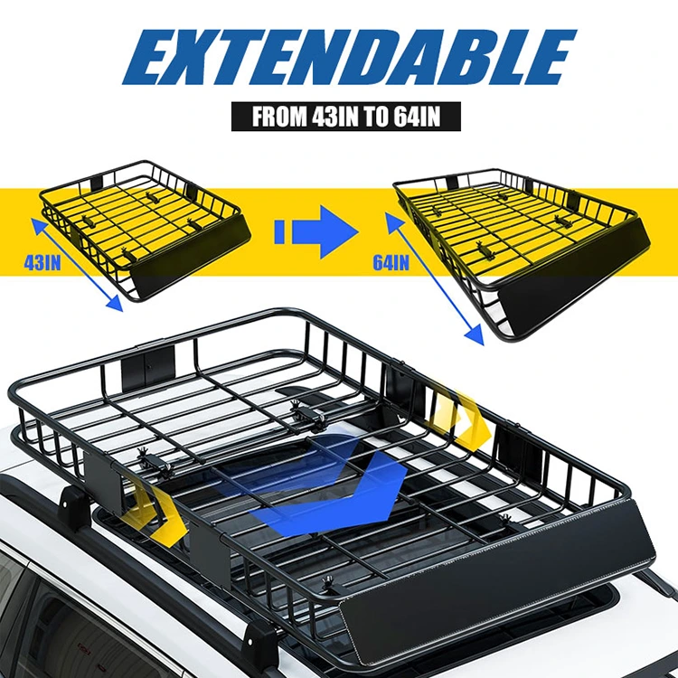 Конструкція, що розширюється: цей кошик для багажника на даху має продуману конструкцію, що розширюється — стандартний розмір (43" x 39" x 6") для компактних автомобілів і з можливістю розширення до 64" для великих транспортних засобів, максимально збільшуючи вантажний простір. Його складна форма дозволяє легко розбирати, транспортувати та зберігати, коли він не використовується. Він підходить для гнучких подорожей і зберігання.