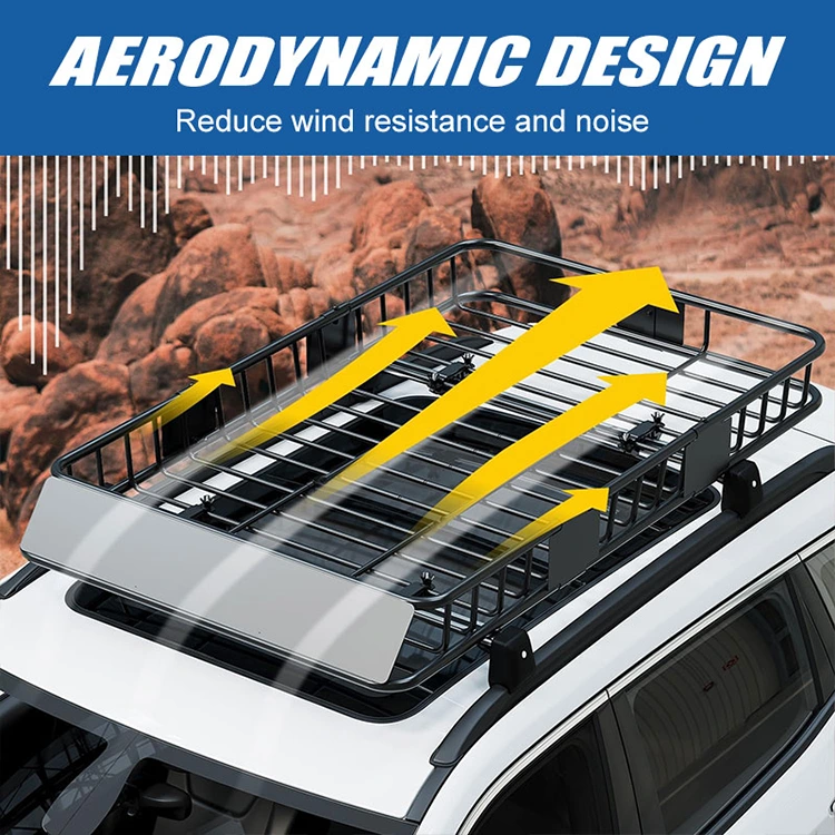 Аеродинамічний дизайн багажника Fancy Roof Rack Carrier Basket зменшує опір вітру та шум під час руху. Конструкція дозволяє повітрю вільно проходити через стійку, зменшуючи опір і споживання палива. Це зручно для їзди по шосе; він пропонує більш тиху та плавну їзду навіть на високих швидкостях.
